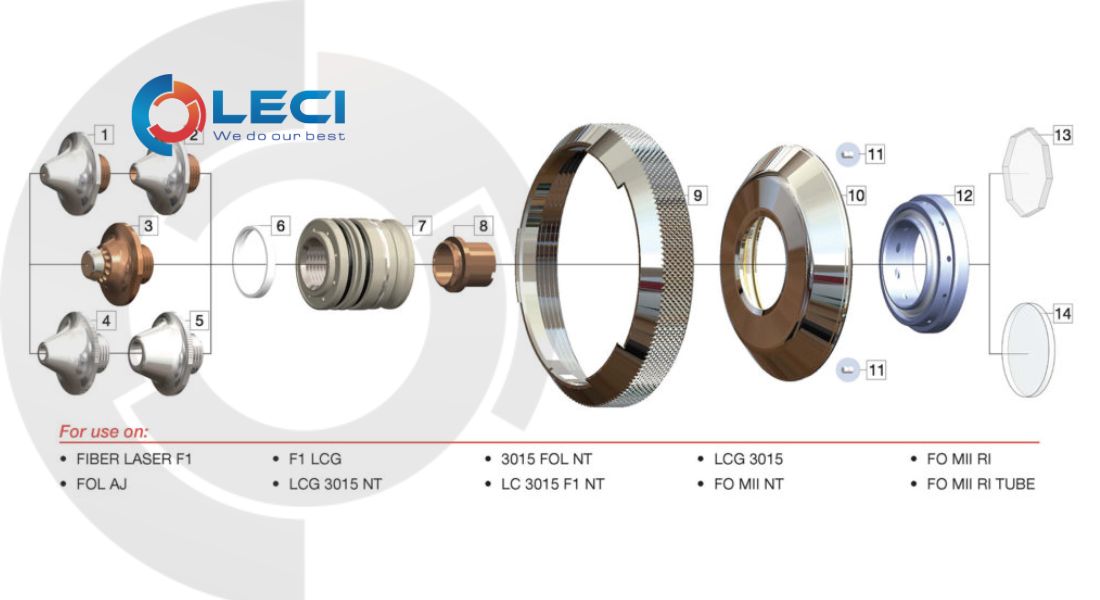 LECI also supplies the full set of genuine AMADA laser nozzle components, all designed and manufactured to AMADA’s rigorous specifications. The image above illustrates the detailed structure of the AMADA laser nozzle assembly, showing all integrated parts within the cutting head. Each component plays a critical role in determining cutting precision, assist gas flow stability, and overall machining efficiency.